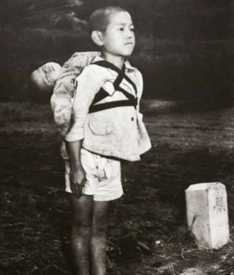 Ετοιμάζοντας το ταξίδι στην Ιαπωνία, (8-19 Νοεμβρίου) προετοιμάζοντας όσα θα δούμε κι όσα θα πούμε, η μικρή φωτογραφία με τα μικρά παιδιά παίρνει διαστάσεις Γκερνίκα μέσα μου, τεράστιος πίνακας σαν οθόνη κινηματογραφική μπροστά μου η στιγμή. Προσπαθώ να κοιτάξω από μια κλειδαρότρυπα του χρόνου, να βρεθώ εκεί, να προσπαθήσω να καταλάβω και πιο πολύ να νιώσω την ψυχή αυτού του παιδιού, πού βρήκε τη δύναμη και φόρτωσε στην πλάτη του τον νεκρό αδερφό στις 6 Αυγούστου του 1945 όταν μάλιστα είχε βγάλει βρώμα η Ιστορία κι έτσι το γραψε κιόλας ότι δήθεν ο πόλεμος τέλειωσε 9 Μαΐου.