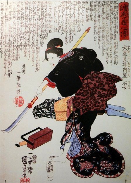 (Βάζει στο Φούτζιο, που κείται νεκρός στο πάτωμα, ένα μανίκι από το κουστούμι της Πριγκίπισσας του Φεγγαριού της Σαύρας και την περούκα. Στη χαλαρή παλάμη του Φούτζιο, η Νέτα βάζει το σπαθί και σα να κατευθύνει μια κούκλα, κινεί το ξίφος απ’ το χέρι του Φούτζιο στη ματωμένη πληγή, σαν να επαναλαμβάνει μια σκηνή αυτοκτονίας.)